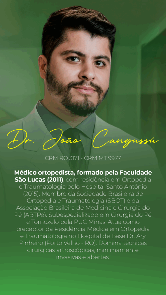 Se você busca um atendimento seguro, qualificado e com resultados de excelência, o Dr. Cangussú é referência em cirurgias do pé e tornozelo. Com ampla experiência e domínio técnico, ele atua com precisão no tratamento de lesões, deformidades, fraturas e problemas crônicos que afetam a mobilidade e a qualidade de vida dos pacientes.